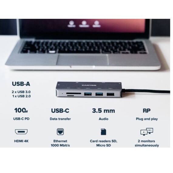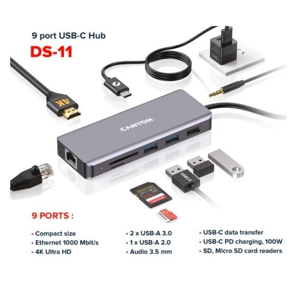 Новый уровень функциональности — 9 портов для универсального подключения! С этим хабом вы сможете подключить к одному порту USB-C практически всё что нужно для дома и работы: HDMI-монитор, наушники или колонки, USB устройства, а также напрямую подключиться к интернету через Gigabit Ethernet. Два порта USB-A 3.0 и один USB-A 2.0 позволят вам подключить всю необходимую компьютерную периферию. Два слота для карт SD и Micro SD позволяют мгновенно переносить большие объемы данных. Разъем для зарядки USB-C PD мощностью до 100 Вт позволяет заряжать подключенное устройство с оптимальной скоростью. Легкий и прочный корпус сделан из алюминия, а потому препятствует возникновению помех в передаче сигнала. Хаб не требует ПО и работает по принципу “Plug and Play”. Максимальная функциональность для ваших гаджетов!