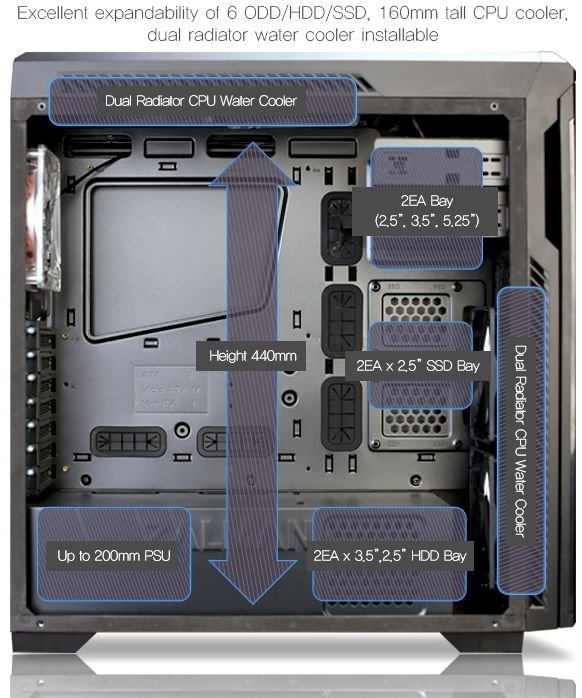 Установленные вентиляторы : 2 x 120 мм на верхней панели, 120 мм на задней панели, 2 x 120 мм на передней панели