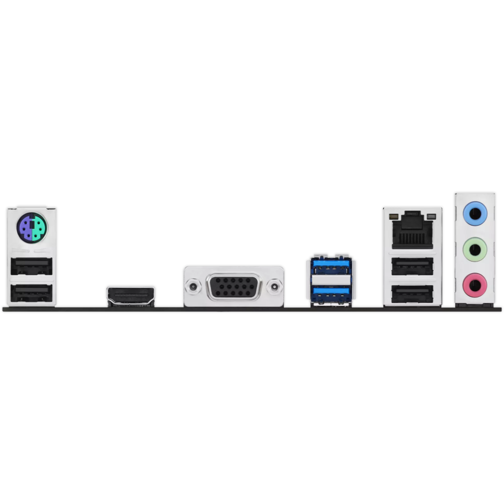 PS/2, 4 x USB 2.0, 2 x USB 3.2 Gen1, VGA, HDMI, RJ-45
