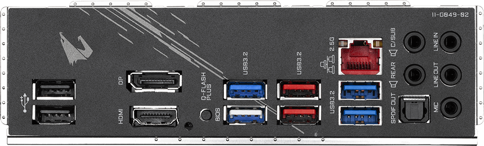 Разъёмы на задней панели : 2 x USB 2.0, 4 x USB 3.2 Gen1, 2 x USB 3.2 Gen2, HDMI, DisplayPort, RJ-45, S/PDIF (оптический)