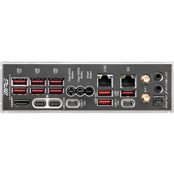 9 x USB 3.2 Gen2, 2 x USB 3.2 Gen2 Type-C, 2 x USB 4 Type-C, HDMI, 2 x RJ-45, S/PDIF (оптический)
