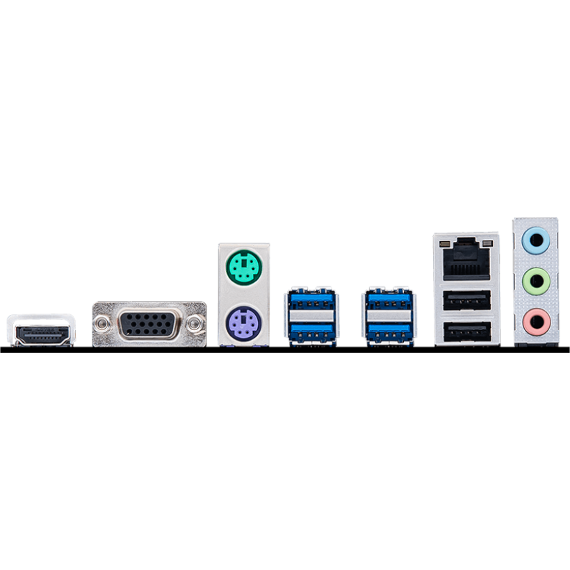 2 x PS/2, 2 x USB 2.0, 4 x USB 3.2 Gen1, VGA, HDMI, RJ-45