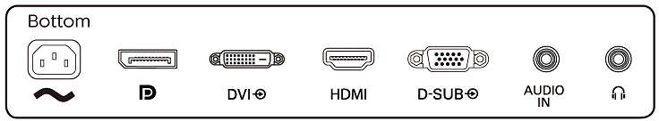 Разъёмы : VGA (D-Sub), DVI-D, HDMI, DisplayPort, выход на наушники, аудиовход