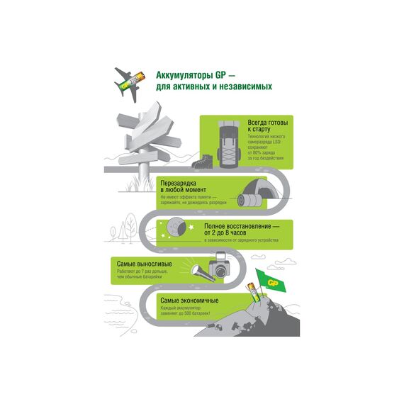 Аккумуляторы GP имеют низкий саморазряд – они сохранят более 70% энергии в течение 2-х лет после заряда.