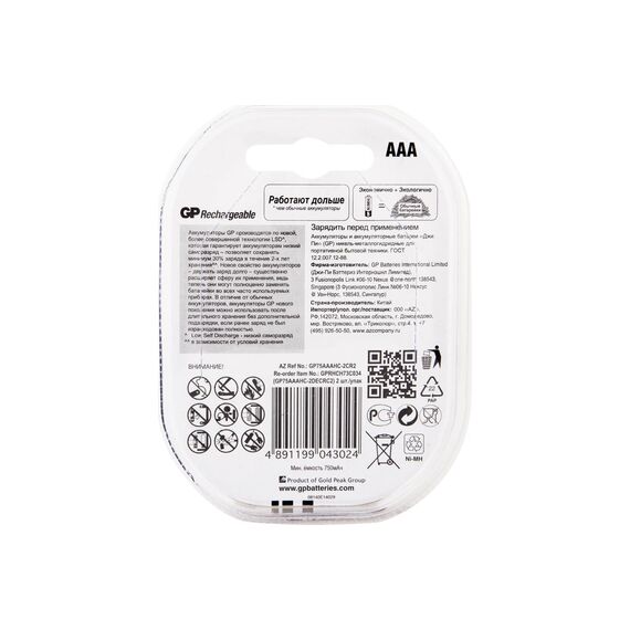 Аккумулятор GP Rechargeable 75AAAHC-2DECRC2 AAA, 1.2V 750 мА·ч, 2 шт.