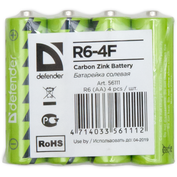 Тип элемента питания Солевой Типоразмер AA (R6) Выходное напряжение 1,5 В Вид упаковки пленка Количество в розничной упаковке 4 шт.