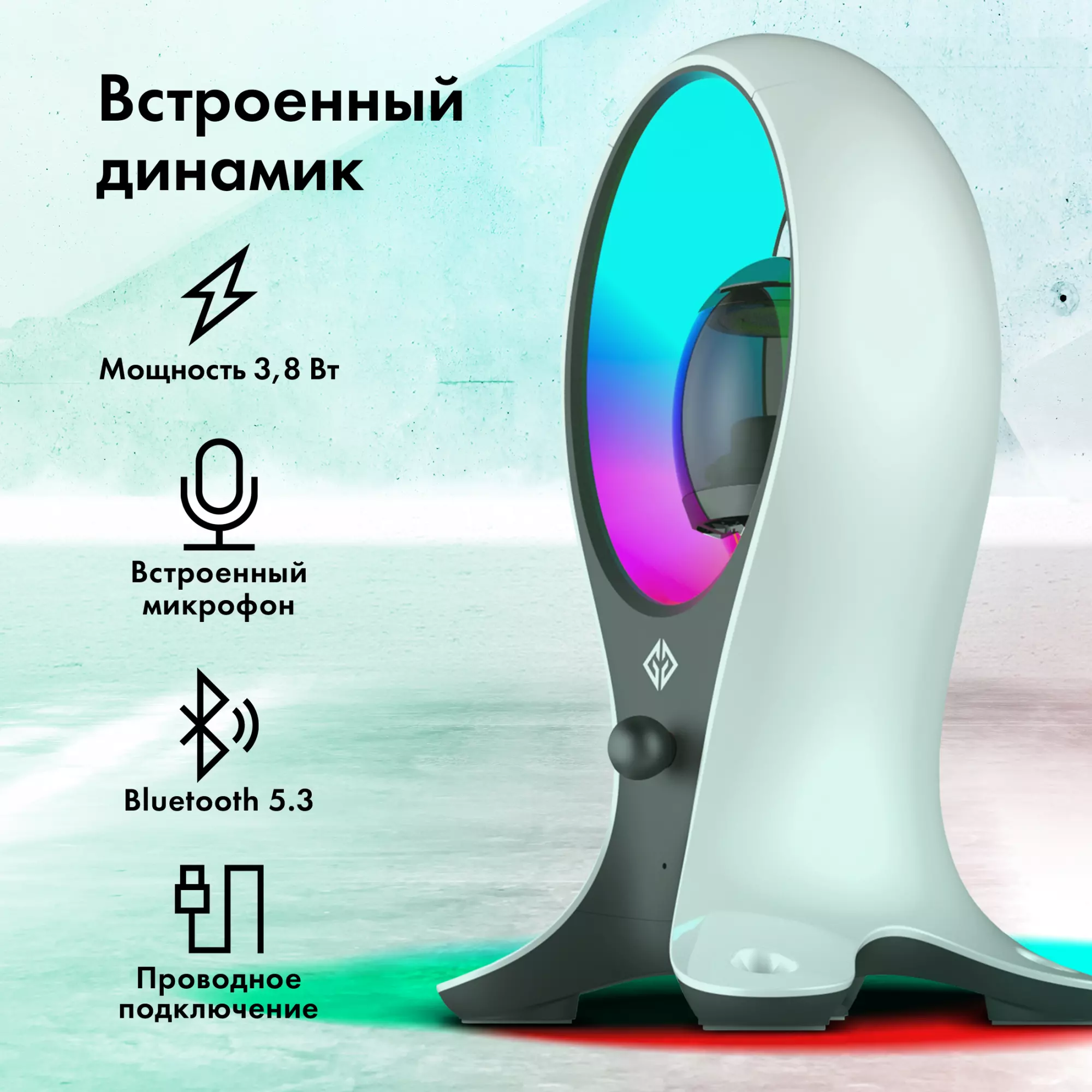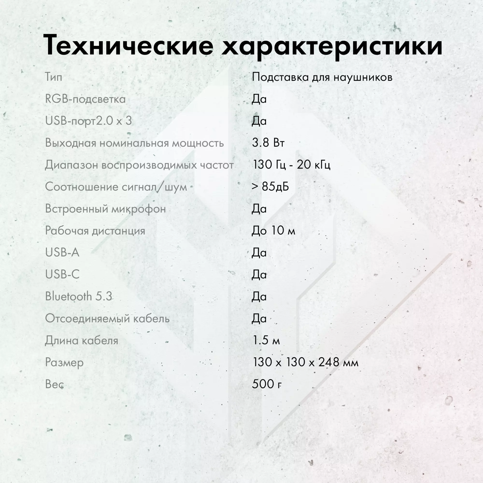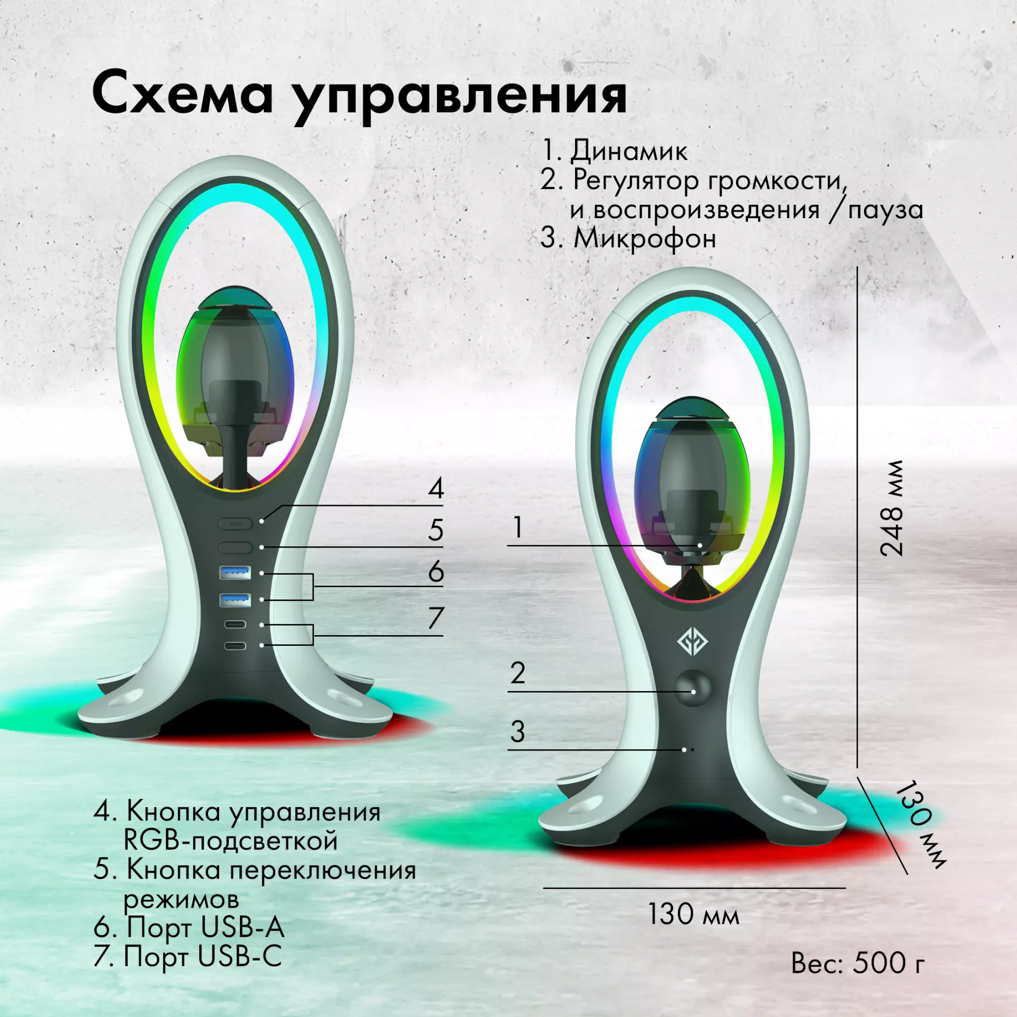 Подставка для гарнитуры с динамической RGB подсветкой, встроенным динамиком для воспроизведения аудио, с поддержкой режима HUB'а. Поддержка BlueTooth.