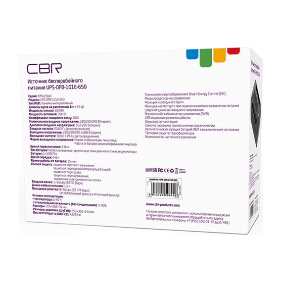 ИБП CBR UPS-OFB-101E-650, 650VA/390W, Schuko CEE 7 Outlets: (x4 Battery & Surge Protected;x4 Surge Protected), LED, AVR, SEC, 12V/7Ah