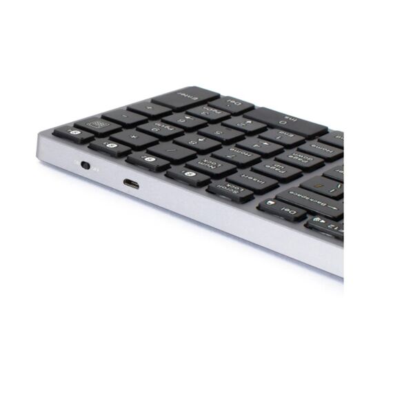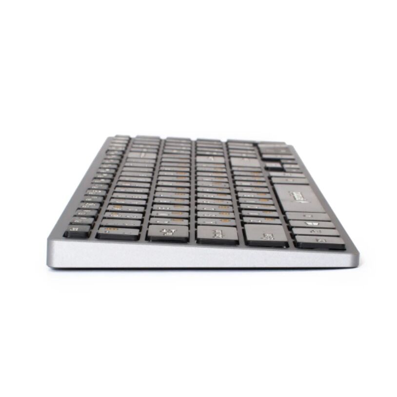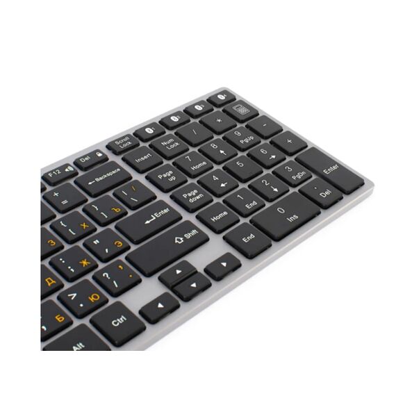 Клавиатура беспроводная бесшумная ножничного типа. Клавиатура для компьютера выполнена в алюминиевом корпусе, что обеспечивает надежность и прочность при работе. Обладает небольшим весом - 442 г.