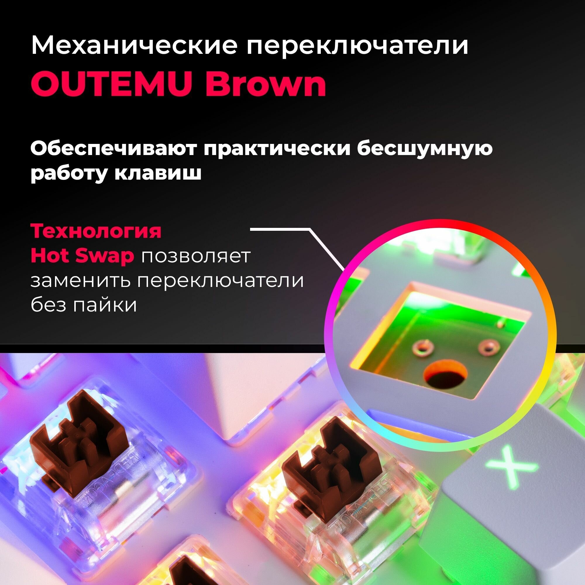 Уникальный дизайн, подсветка и отличные характеристики - фишка этой клавиатуры. В этой компактной клавиатуре стоят тихие коричневые переключатели с функцией Hot Swap