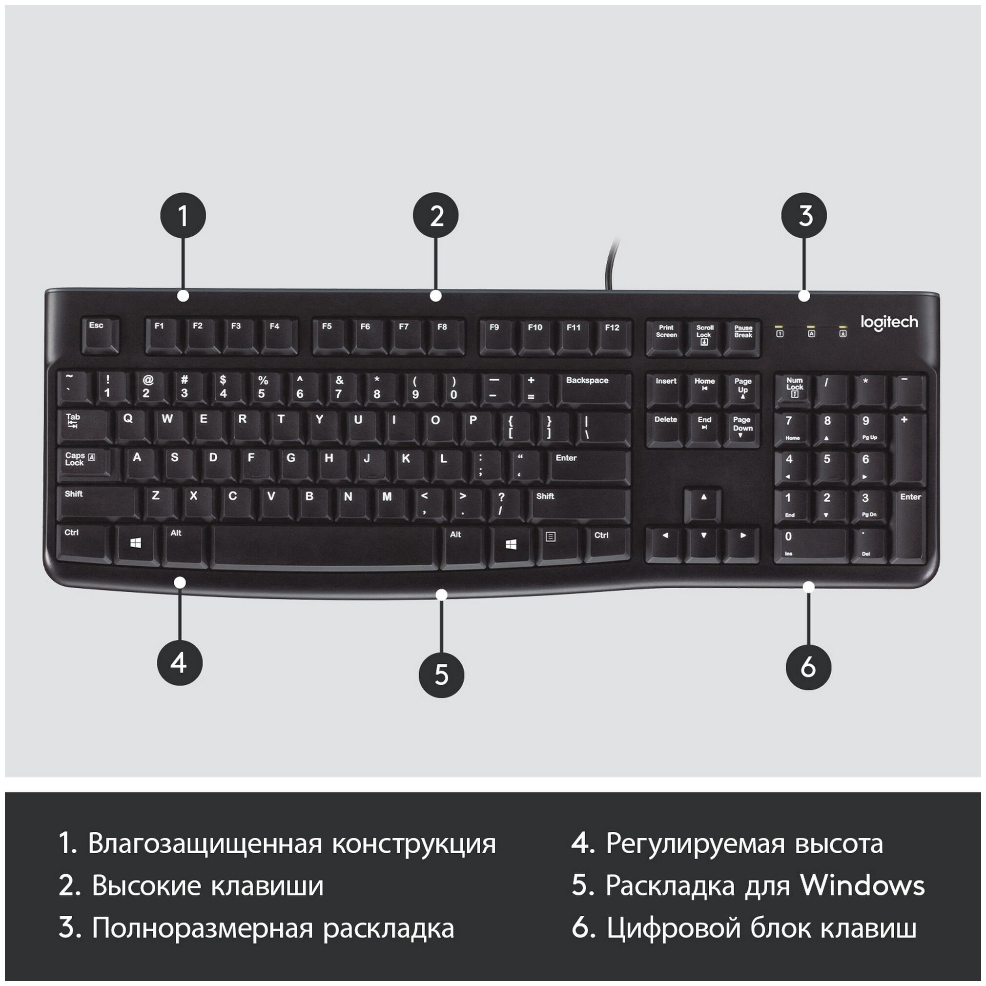 Комфорт целый день: конструкция клавиатуры обеспечивает удобный набор текста благодаря клавишам с глубоким профилем и полноразмерной стандартной раскладке с F клавишами Легко настроить и использовать: настройка не может быть проще, просто подключите клавиатуру через USB к компьютеру и сразу начните ею пользоваться без установки программного обеспечения