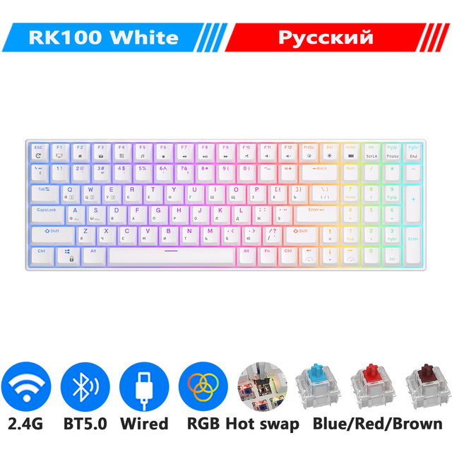 Клавиатура Royal Kludge RK100 White USB/2.4 GHz/Bluetooth/RGB/Hot Swap/Red switch