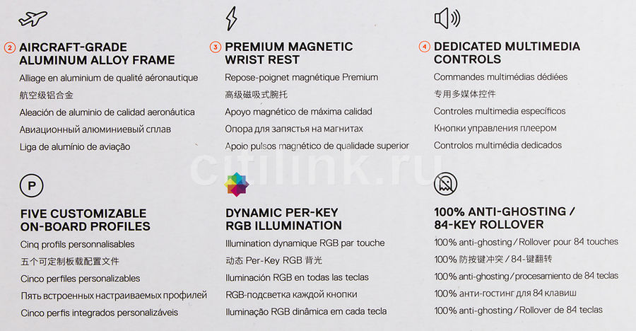Особенности: Совместимость: PC, Mac, PS4, Xbox. Встроенная память для сохранения профиля (5 встроенных профилей). Раскладывающиеся ножки. Назначение дополнительных клавиш: мультимедия, переключение режимов, программируемые макроклавиши, регулировка подсветки