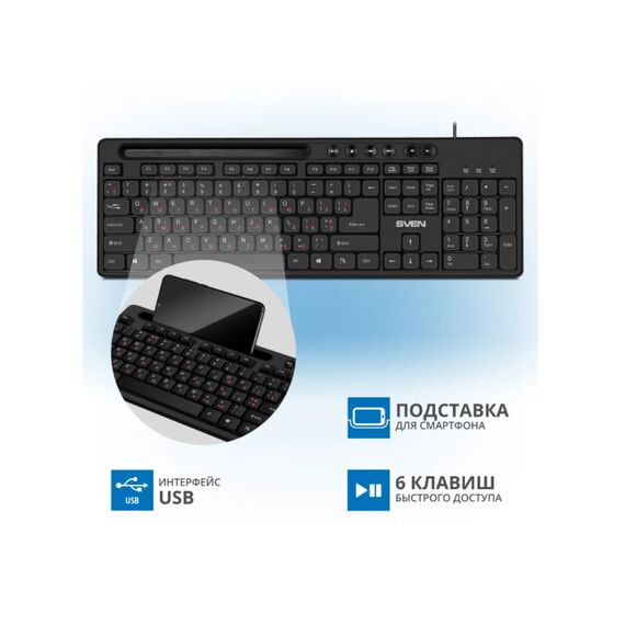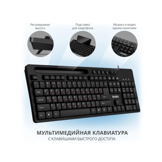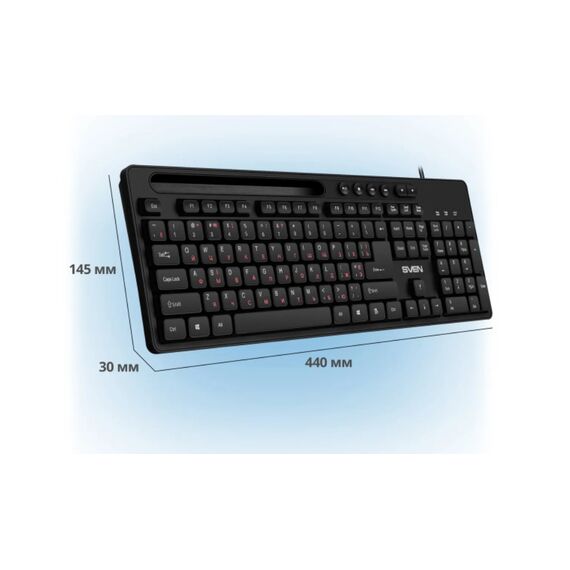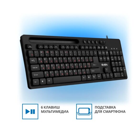Помимо компьютера у большинства пользователей есть еще и смартфон, который очень хочется держать перед глазами — на него приходят различные уведомления, на его экран можно вывести дополнительную информацию из игр… Со SVEN KB-S302 сделать это стало как никогда легко — ведь у нее есть специальная подставка под телефон. А еще модель оборудована шестью мультимедийными кнопками, благодаря которым управление воспроизведением медиаконтента и навигация в браузере осуществляются максимально просто и оперативно.Раскладка у клавиатуры стандартная, она содержит 110 клавиш с приятным мягким ходом. Несмотря на ее компактные размеры, нашлось место и для полновесного «двухэтажного» Enter, и для длинных кнопок Shift. Те, кто много работает с числами, оценят наличие цифрового блока. Высота может регулироваться с помощью раскладных ножек. Небольшие резиновые накладки на нижней поверхности клавиатуры предотвращают скольжение устройства по столу. Символы на клавиши нанесены хорошо читаемой краской, русские буквы выделены красным цветом — в общем, для обеспечения комфорта использования приложен максимум усилий.