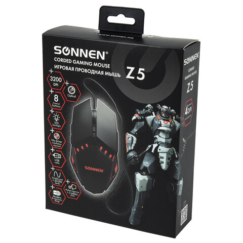 Мышь SONNEN Z5 (513521), металл/пластик, проводная, игровая, черная