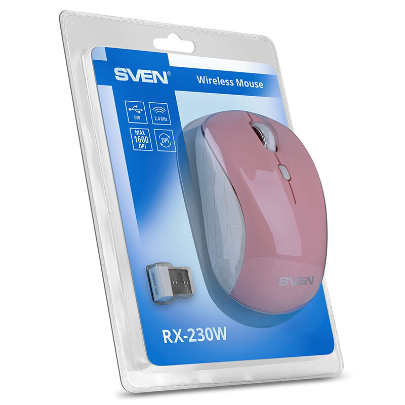 Хотите удобство и свободу движения при работе с компьютером или ноутбуком? Тогда наша беспроводная мышка SVEN RX-230W - это то, что вам нужно! Беспроводная мышь обеспечивает максимальную свободу передвижения, без необходимости проводов и ограничений. Вы можете комфортно работать на расстоянии до 10 метров от компьютера или ноутбука, позволяя вам свободно перемещаться по комнате или офису. Мышка имеет стильный и современный дизайн, и доступна в различных цветах. Если вы любите розовый цвет, то мы предлагаем вам выбрать розовую беспроводную мышь, которая будет не только функциональным компьютерным аксессуаром, но и стильным дополнением к вашему рабочему столу. RX-230W оснащена специальной кнопкой, переключающей режимы разрешения от 800 до 1600 DPI, которая позволяет найти удобное сочетание скорости и точности перемещения курсора. Одной из главных особенностей беспроводной мыши является ее бесшумность. Благодаря специальному дизайну кнопок, вы можете работать или играть в полной тишине, не беспокоя окружающих. Это особенно важно, если вы используете мышь в офисной или в кафе. Мышка подключается к компьютеру или ноутбуку посредством беспроводного компактного USB-адаптера, что делает ее совместимой с большинством устройств. Вы можете подключить ее к вашему компьютеру, ноутбуку или даже макбуку без необходимости использования дополнительных проводов или приемников. Благодаря компактным размерам и массе чуть более 50 г, устройство не занимает много места в кейсе для ноутбука. Компьютерная мышь SVEN RX-230W понравится тем, кто ценит изящество, компактность и удобство эксплуатации.