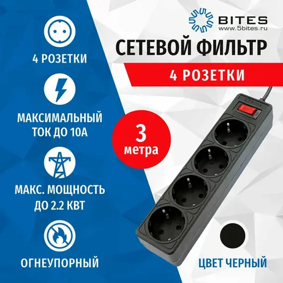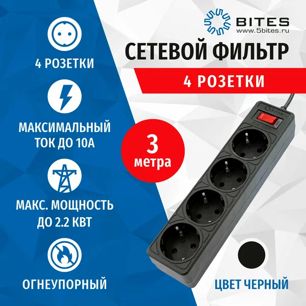 Сетевой фильтр 5bites Garda SP4B-530 4S/3*0.75mm2/3M/Black