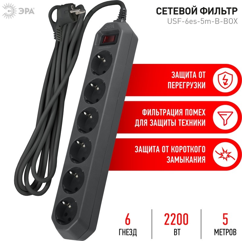 Сетевой фильтр ЭРА USF-6es-5m-B-BOX (Б0037265) 6 розеток 5 м черны