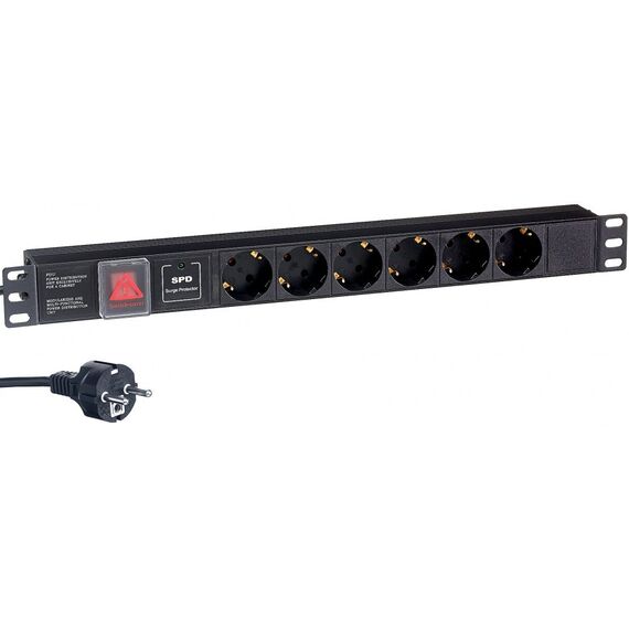 горизонтальный блок розеток, евровилка с заземлением, розетки: 6x Schuko, макс. ток нагрузки 16A, фильтр защиты, выключатель с подсветкой, стандарт VDE, EAC, кабель 2м