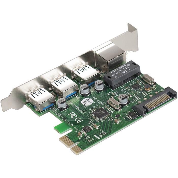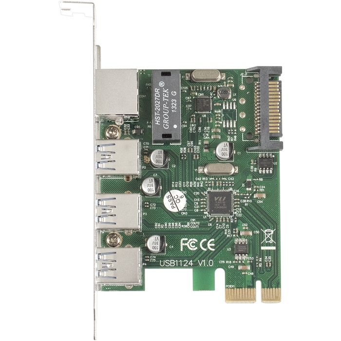 Контроллер сетевой ExeGate EXE-361 EX283714RUS (PCI-E x1 v2.0, 3*USB3.0 ext. + LAN UTP 1000Mbps, разъем доп.питания, Chipset VL805 + RTL8153B)