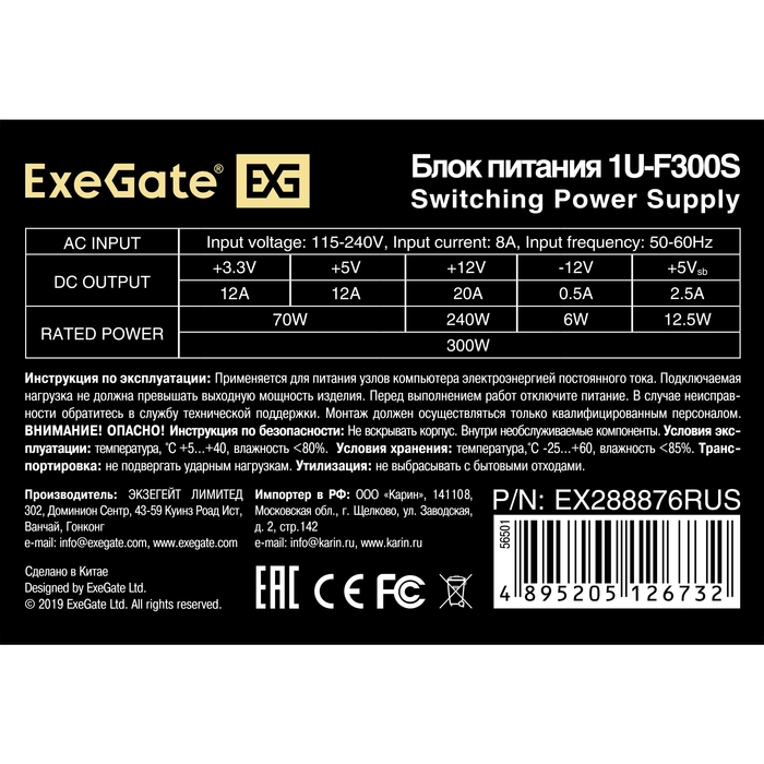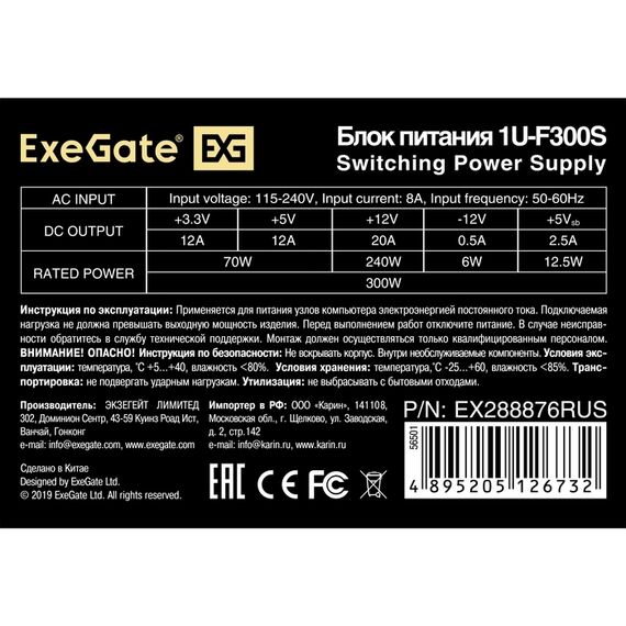 Блок питания ExeGate F300S EX288876RUS 300W (Flex ATX, for ITX case, 4cm fan, 20+4pin, 4рin, 3xSATA, 2xIDE)