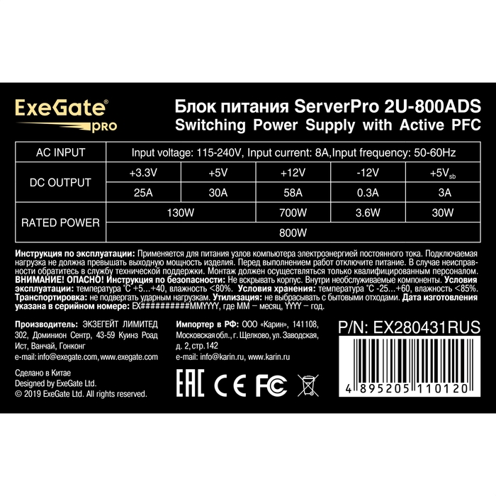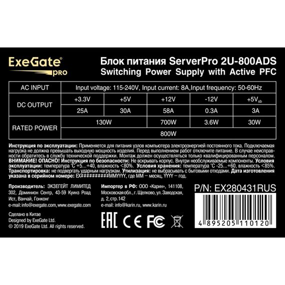Блок питания Exegate ServerPRO-2U-800AD EX280431RUS 800W APFC, унив. для 2U, 24pin, 2*8pin, 3xSATA, 5xIDE