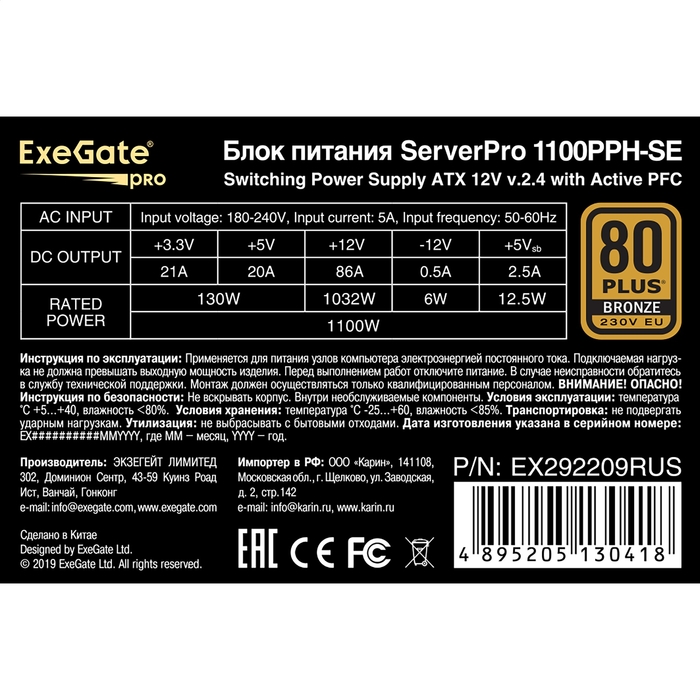 Блок питания ExeGate ServerPRO 80 Plus Bronze 1100PPH-SE EX292209RUS 1100W (ATX, for 3U+ cases, APFC, КПД 89 (80 Plus Bronze), 12cm fan