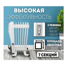 Технические характеристики Тип масляный радиатор Регулировка мощности есть Уровни мощности 1500/900/600 Вт Максимальная площадь обогрева 15 кв.м Напряжение 220/230 В Количество секций 7...