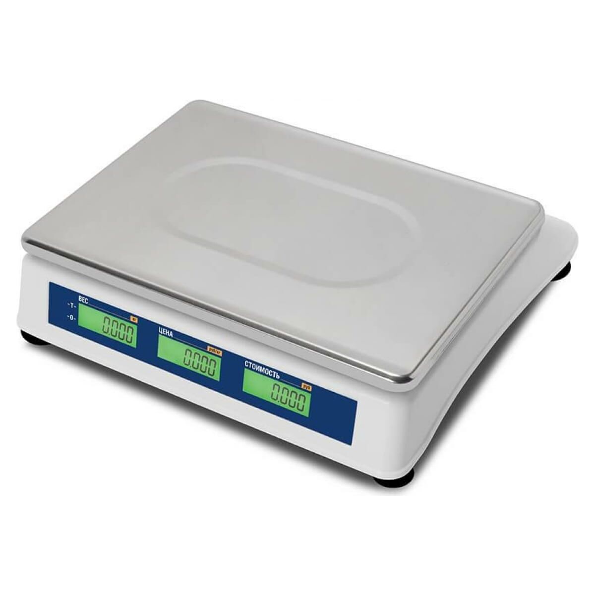 Со стороны покупателя и со стороны продавца установлено по 2 LCD экрана на 16 разрядов. Они показывают результаты измерений и расчетов: массу груза на платформе, стоимость 1 кг, общую стоимость покупки. Устройство не подключается к ПК.