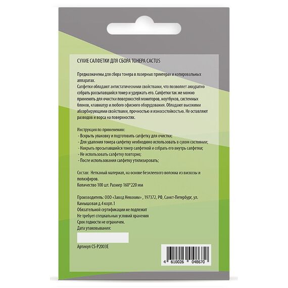 Описание Одноразовые безворсовые салфетки Cactus предназначены для очистки поверхности и сбора тонера в лазерных принтерах и копировальных аппаратах. Данные салфетки обладают антистатическими свойствами и пористой фактурой, что позволяет аккуратно собрать рассыпавшийся тонер и удержать его.