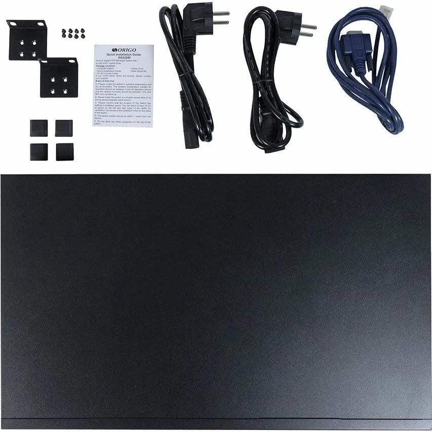 Коммутатор OS3228F,кабель питания (2 шт.),консольный кабель с разъемом RJ-45,комплект для установки в 19-дюймовую стойку,краткое руководство по установке