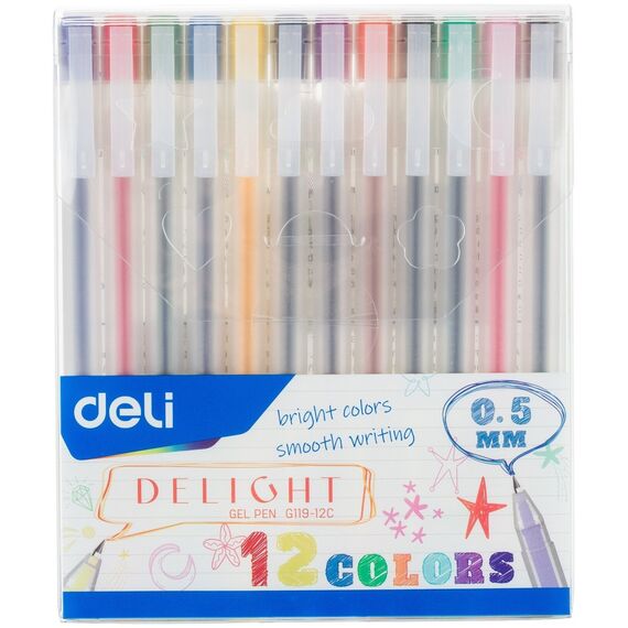 Набор гелевых ручек Deli, выполненных в приятном матовом пластиковом корпусе. Ручки имеют прочный металлический наконечник. В наборе ручки 12 цветов. Толщина линии — 0.5 мм. Ручками легко писать, они скользят по бумаге, обеспечивая мягкое письмо. Чернила быстро высыхают, не размазываются. Набор поставляется в прозрачной пластиковой упаковке, на которой имеется трафарет — ребенок с легкостью нарисует сердечко, цветок, звездочку, месяц и облако.