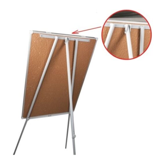 Белое лаковое покрытие предназначено для письма специальными маркерами для белой доски. Размер доски – 100х70 см. Регулируется по высоте до 164 см. Устанавливается на треноге. Металлическая поверхность позволяет размещать объявления при помощи магнитов. Блокнот крепится при помощи неподвижных винтов.