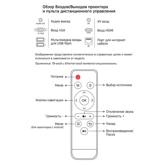 Возможность по установке: Фронтальная проекция, Обратная проекция, Крепление к потолку