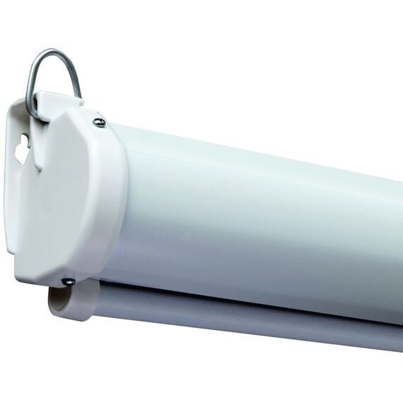 Особенности: Ручной привод. Корпус экрана полукруглого сечения выполнен из стали с белым полимерным покрытием и ударопрочного пластика. Нижняя натяжная стальная планка круглого сечения диаметром 20 мм с белым полимерным покрытием.