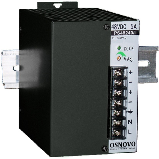 Промышленный блок питания. DC48V, 5A (240W). Входное напряжение AC230V. КПД: 84%. Регулировка выходного напряжения в диапазоне 45-53V. Защита от короткого замыкания, перенапряжения и перегрузки. Принудительная система охлаждения (вентилятор). Монтаж на DIN-рейку или стену. Размеры (ШxВxГ): 75x110x121мм. Рабочая температура: -40...+50°C.