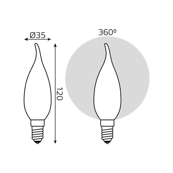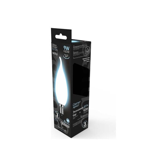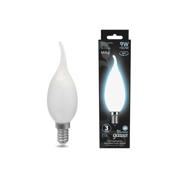 Технические характеристики Gauss Filament свеча на ветру, 9W, 610lm, 4100К, Е14, milky, LED 104201209