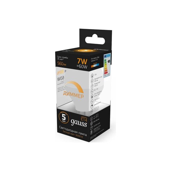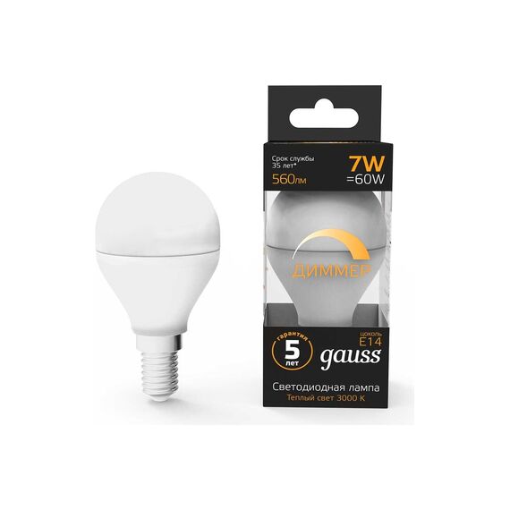 Лампа GAUSS LED Шар-dim E14 7W 560lm 3000К 105101107-D надежный источник освещения высокого качества. Благодаря использованию качественных комплектующих и современных технологий лампы этой серии имеют один из самых высоких показателей энергоэффективности и долговечности.