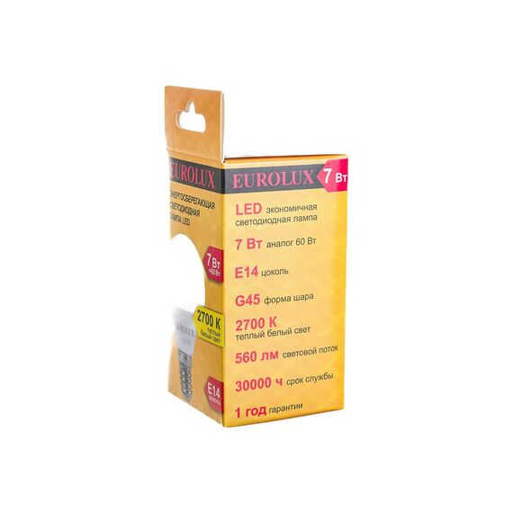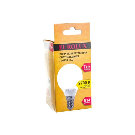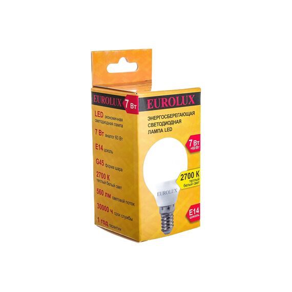 Технические характеристики Eurolux LL-E-G45-7W-230-2,7K-E14 шар, 7Вт, теплый белый, Е14 76/2/5