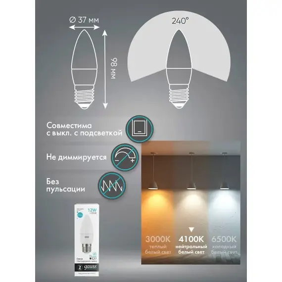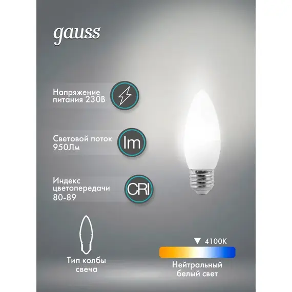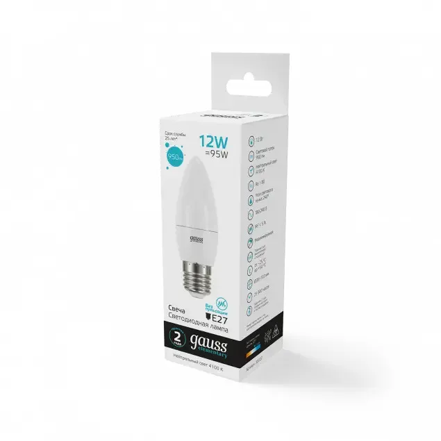 Светодиодные лампы Gauss Elementary Candle созданы в форме свечи. Лампы подойдут как для домашнего, так и для коммерческого использования. Такой тип освещения прекрасно смотрится в светильниках без плафонов или устанавливается в люстры и бра. Модель обладает широким диапазоном цветовых температур и мощностей, что поможет создать атмосферу тепла и уюта или концентрации. Равномерный спектр света создает зрительный комфорт в любом помещении. Данный тип освещения от Gauss обеспечивают стабильную работу в течение всего срока службы., площадь освещения 2.4 кв.м., соответствует лампе накаливания - 120W