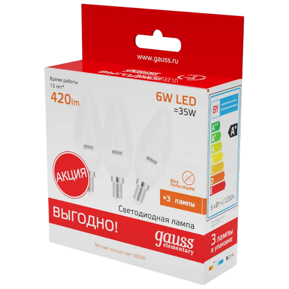 Светодиодная лампа Gauss Elementary Свеча 6W 420lm 3000K E14 (3 лампы в упаковке) LED 1/40 33116T подойдет как для домашнего, так и для коммерческого использования. Такой тип освещения прекрасно смотрится в светильниках без плафонов или устанавливается в люстры и бра. Равномерный спектр света создает зрительный комфорт в любом помещении.