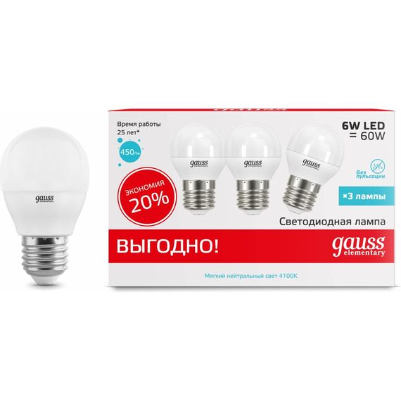 Лампа светодиодная Gauss Elementary 53226T 6Вт E27 шар 180B 4100K св.свечения белый нейтральный уп/3шт