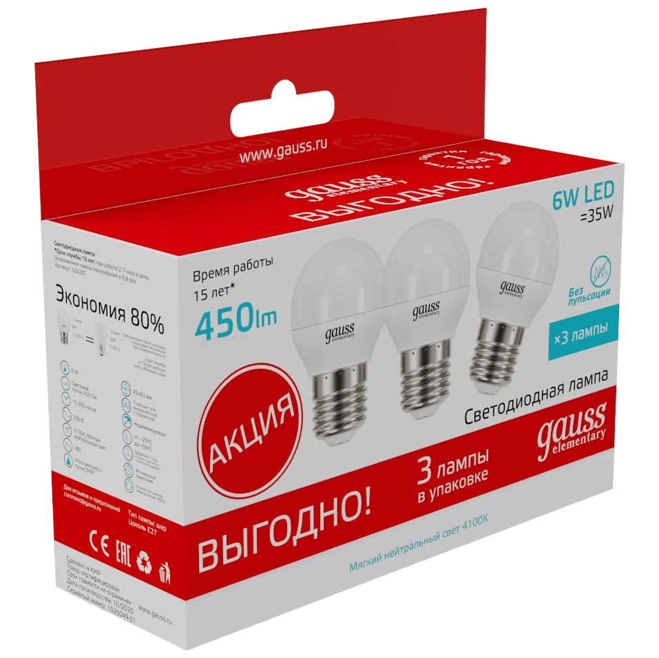Лампа Gauss LED Elementary Globe 6W E27 4100K 1/40 3 лампы в упаковке SQ53226T является энергосберегающей заменой обычным лампам накаливания. Равномерное распределение света создает зрительный комфорт в любом помещении.