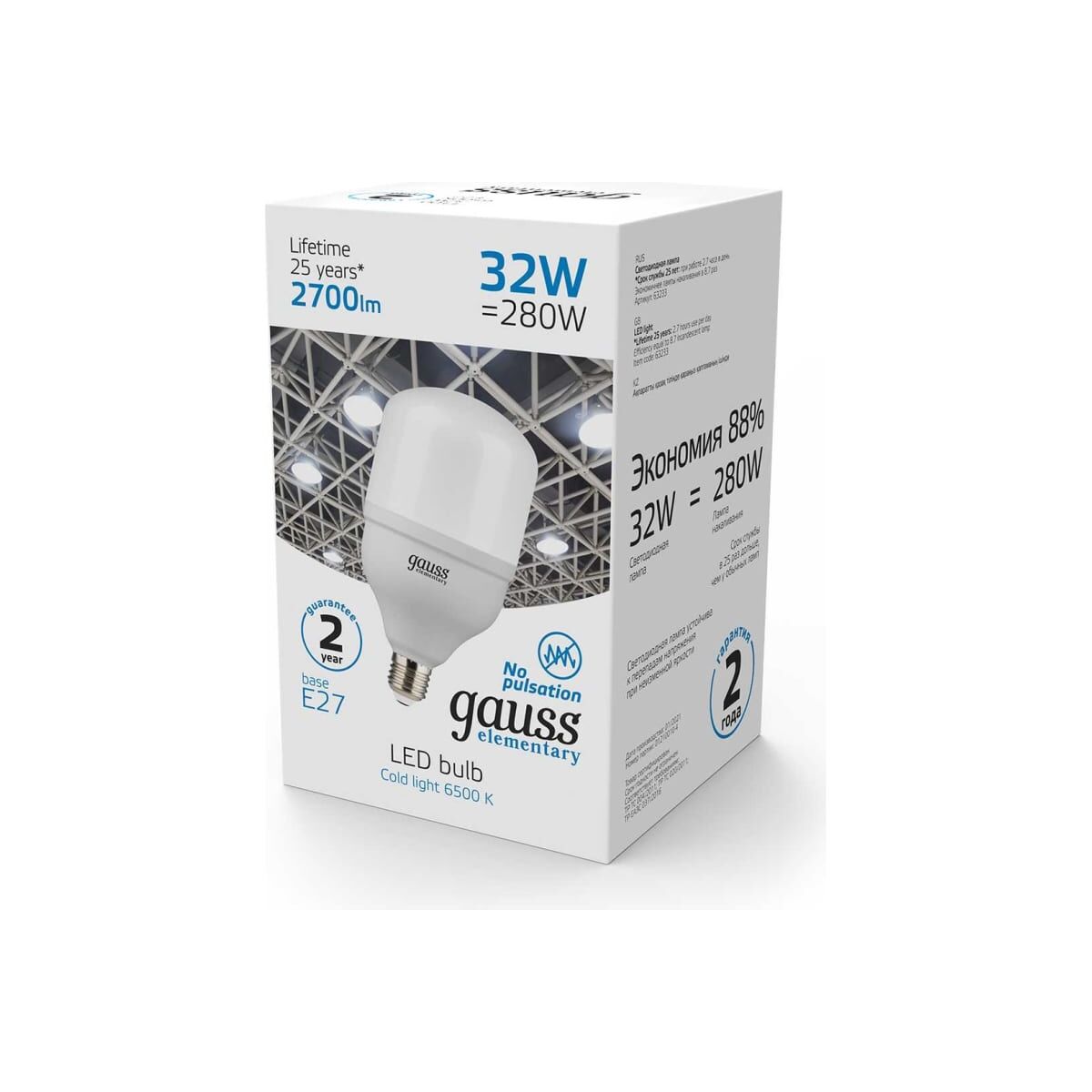 Лампа Gauss Elementary LED T100 E27 32W 2700lm 180-240V 6500K 63233 высокой мощности в основном используется в освещении помещений большой площади и высокими потолками (от 3,5 метров), а также в уличных системах освещения.