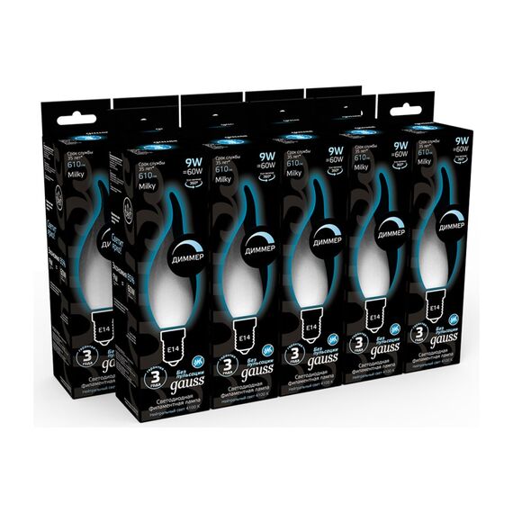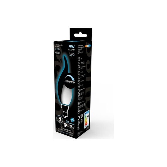 Технические характеристики Gauss Filament свеча на ветру, 9W, 610lm, 4100К, Е14, milky, LED 104201209-D