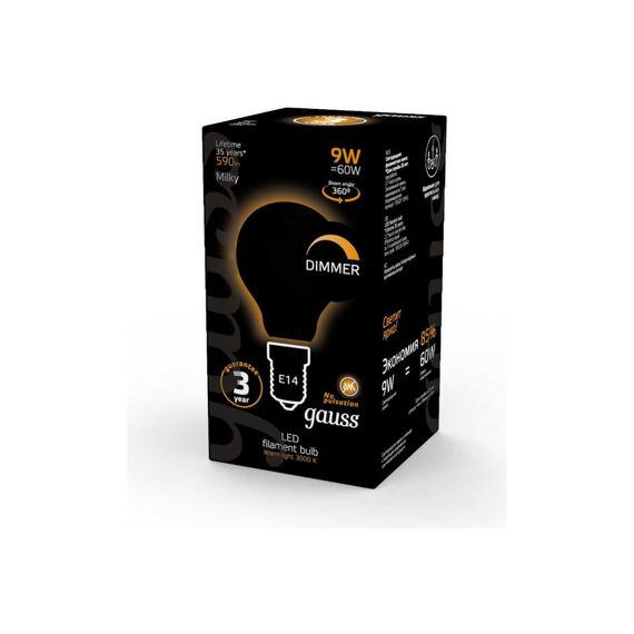 Технические характеристики Gauss Filament шар, 9W, 590lm, 3000К, Е14, milky, LED 105201109-D