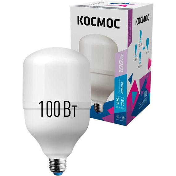 Мощная светодиодная лампа Т160 100Вт КОСМОС цоколь E27, является аналогом лампы накаливания 650Вт. Рабочая температура - 30 + 40. Работает в диапазоне напряжений 174-265V.В основе лампы используются чипы от мирового лидера Epistar, что обеспечивает надежную и стабильную работу в течение всего срока службы (50 000 часов). До 90% экономии энергии по сравнению с обычной лампой накаливания (сопоставимы по размеру); стабильный световой поток в течение всего срока службы; экологическая безопасность (не содержит ртути и тяжелых металлов); мягкое и равномерное распределение света повышает зрительный комфорт и снижает утомляемость глаз; благодаря высокому индексу цветопередачи (>80), свет лампы комфортен и передает естественные цвета и оттенки; Цвет свечения лампы - дневной белый, 6500K, идеально подойдет для зон, где необходим яркий и мягкий свет от 1 источника света. Кухня, коридор - места, где лампа поможет создать максимум яркости в компактном корпусе светильников в стиле лофт, на высоте от 6 метров. Размер лампы составляет 120мм на 205мм ми идеально сможет заменить лампу 650Вт при существенной низкой потребляемой мощности. В комплекте поставляется переходник на цоколь Е40, что делает лампу универсальной и расширяет ее применение для замены ламп ДРВ.