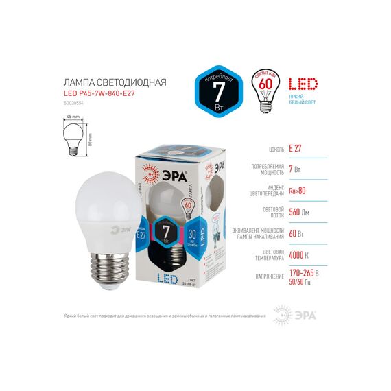 Технические характеристики ЭРА LED smd P45-7w-840-E27 Б0020554