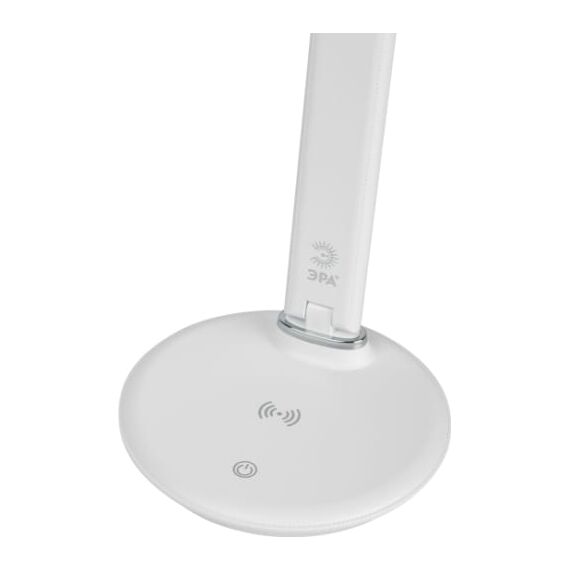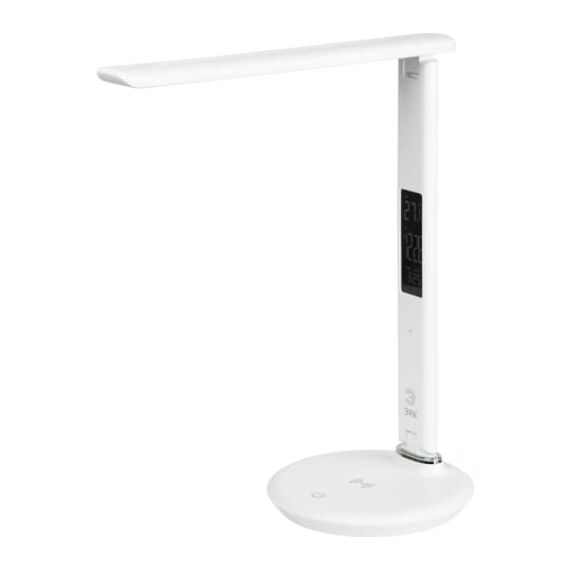 Настольный светильник ЭРА NLED-505-10W-W со светодиодами (LED) в качестве источников света в дизайне "под кожу". Удобная складная конструкция с сенсорным управлением, возможностью выбора цветовой температуры и плавным диммером для регулировки яркости. На основании светильника расположен встроенный модуль Qi для беспроводной зарядки мобильных устройств. Просто положите телефон, поддерживающий функцию Qi на основание светильника в отмеченной зоне - светильник подзарядит его. Главное преимущество светильника - многофункциональный дисплей с функциями часов, будильника, календаря и термометра.