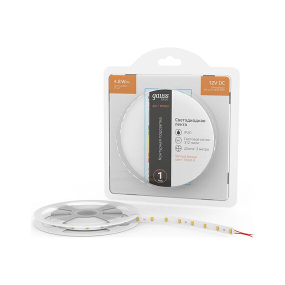 Лента Gauss Basic 12V 4,8W/m 312lm/m 3000K IP20 LED 3m BT002 способна решить ряд задач связанных как с декоративным освещением помещений, так и с экстерьерной подсветкой.